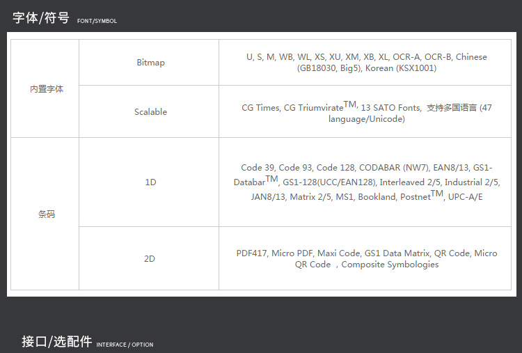 Bitmap:U,S,M,WB,WL,XS,XU,XM,XB,XL,OCR-A,OCR-B,Chinese(GB18030,Big5),Korean(KSX1001) Scalable:CG Times,CG Triumvirate,13 SATO Fonts,支持多國(guó)語(yǔ)言(47國(guó)語(yǔ)言Unicode) |